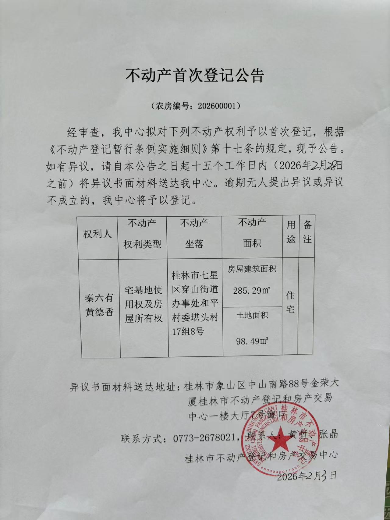 关于秦六有、黄德香的不动产首次登记公告