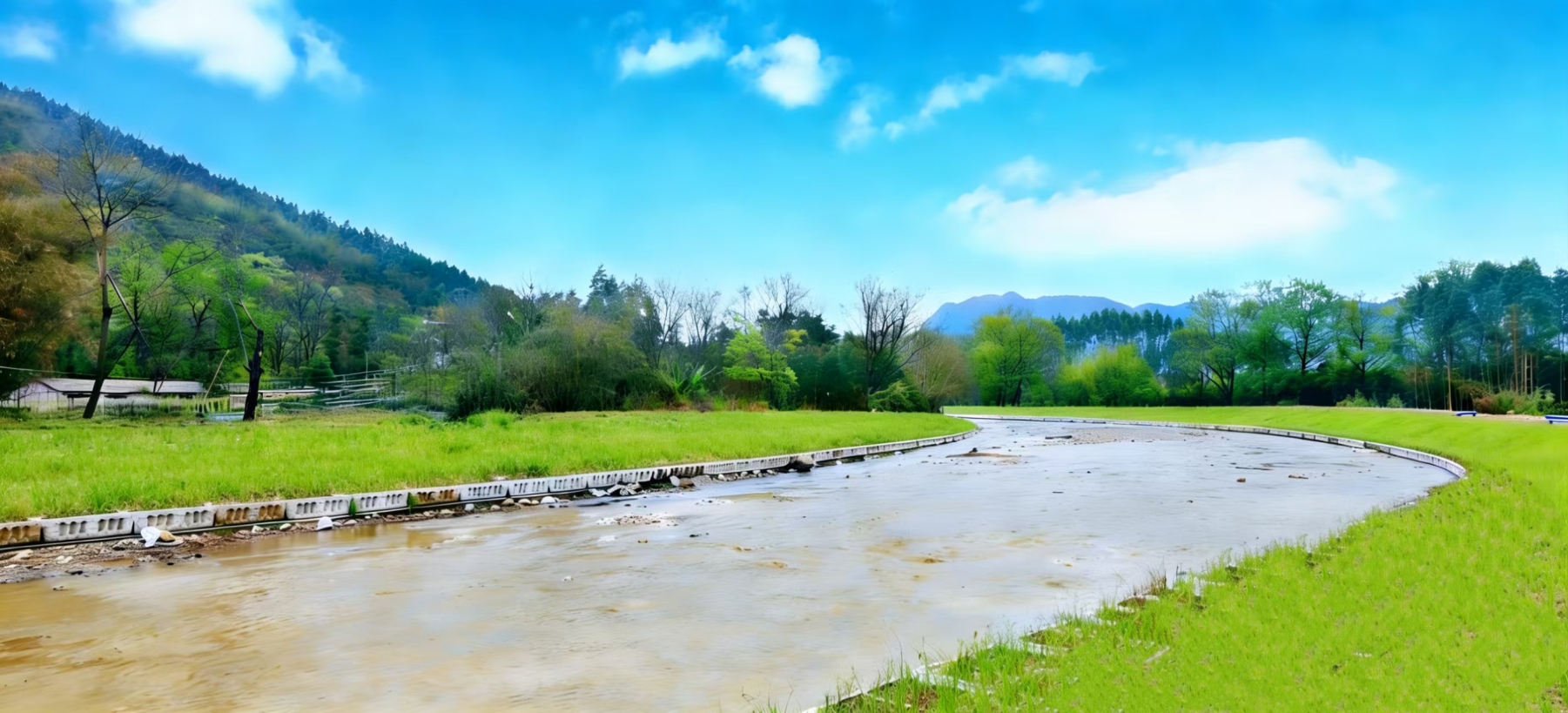 灵川县绿宝河至桃花江水系连通工程(三期)社江河生态修复工程位于九屋镇,共治理河长7.95km,新建护岸总长7.19km,修复生态缓冲带19619.70㎡。在项目实施过程中,通过铺设生态砖,沿线设置排水涵管3处,两栖动物通道33处,其下留有缝隙供蛙类、鱼虾休憩产卵,其上种植花草保持水土。远远望去,社江水光潋滟,绿草如茵,一排排生态砖整齐地排列在河道两岸;走近细看,种植的月季含苞待放,小鱼虾在生态砖的缝隙间来回游弋,构成一幅生机勃勃的明丽画卷。