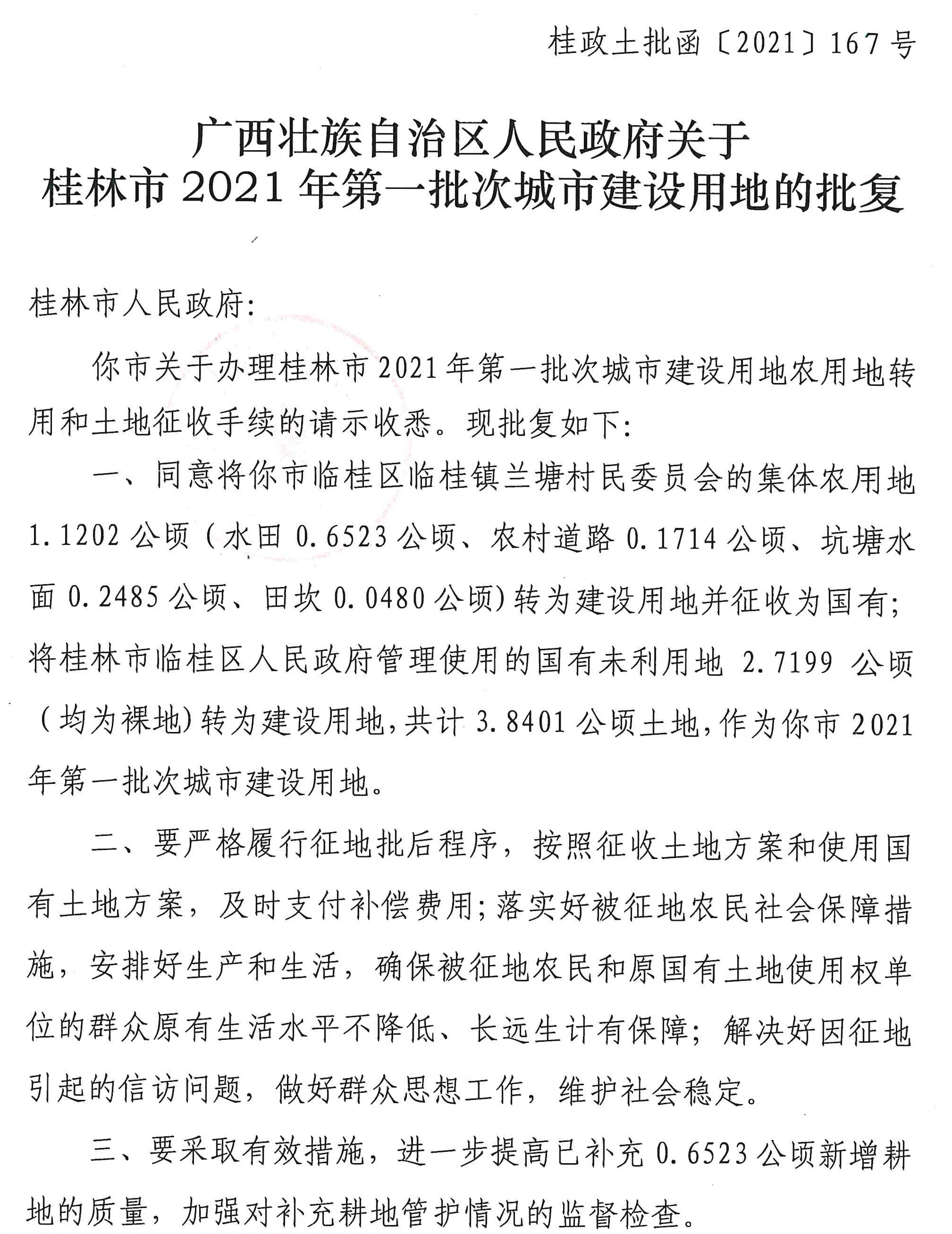 广西壮族自治区人民政府关于桂林市2021年第一批次城市建设用地的批复