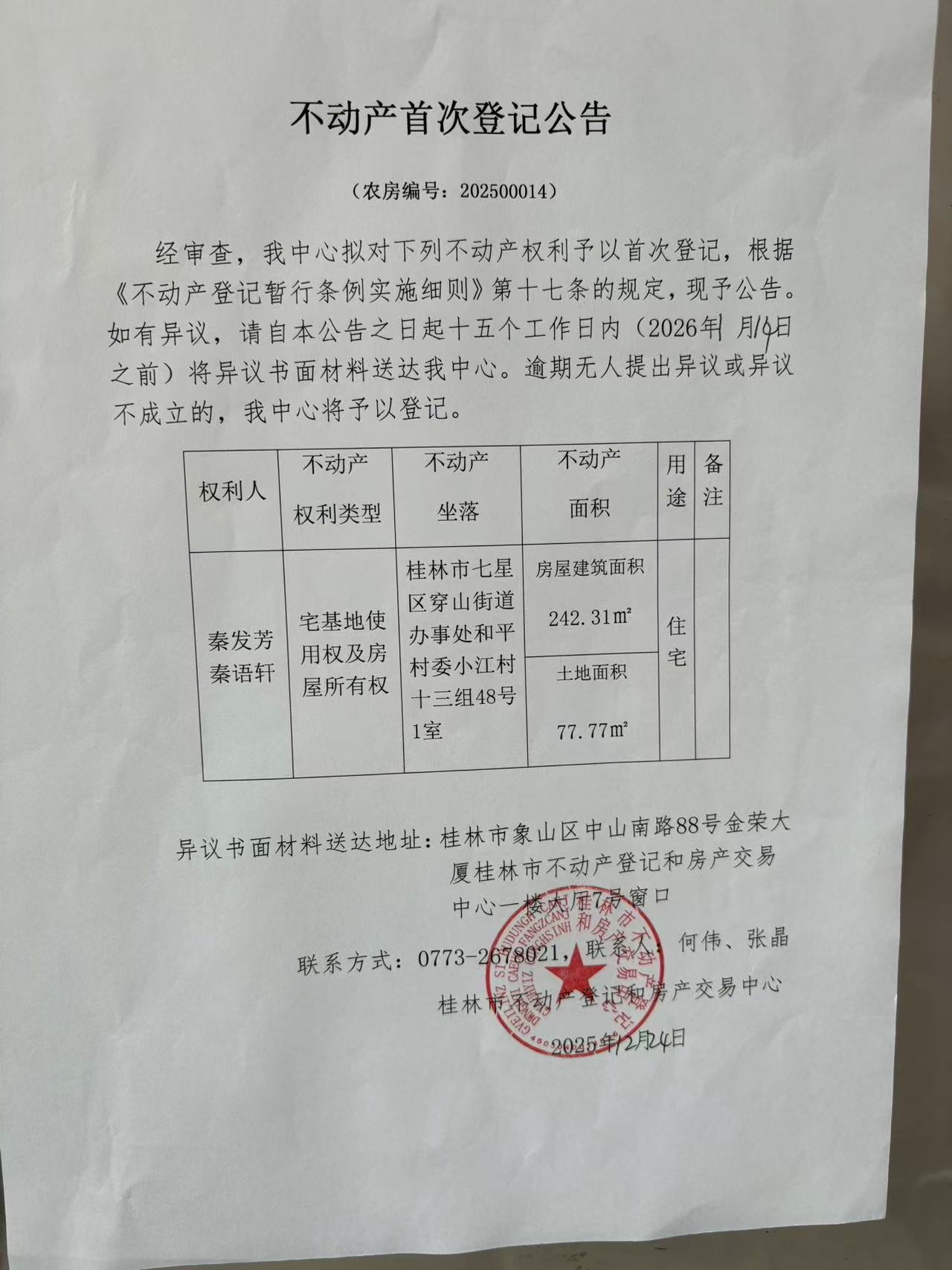 关于秦发芳、秦语轩的不动产首次登记公告