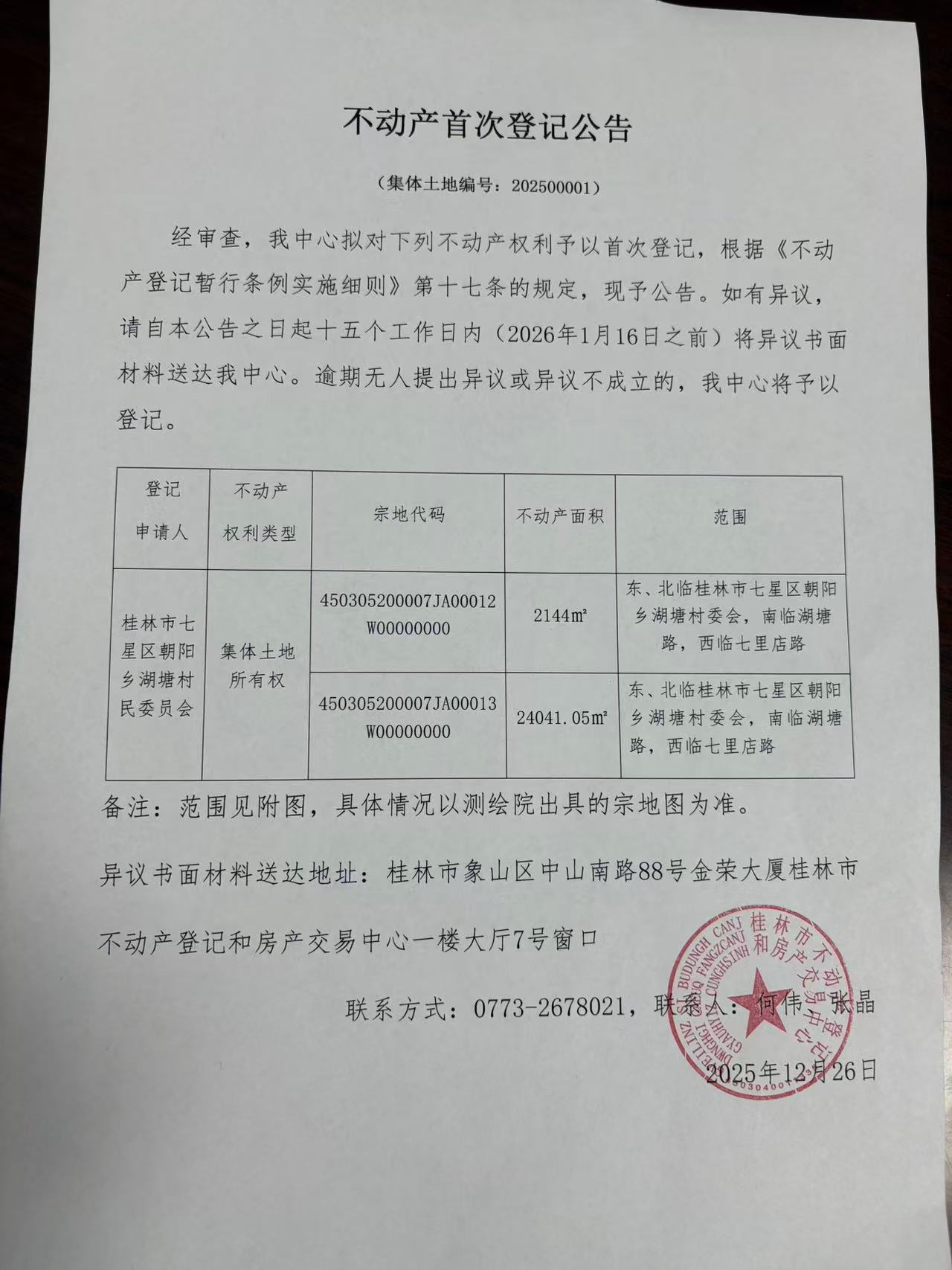 关于桂林市七星区朝阳乡湖塘村民委员会的首次登记公告