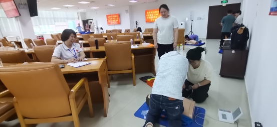 随后的模拟演练环节,干部职工们热情高涨,纷纷积极参与实践操作。在老师的一对一指导下,大家按照标准流程进行心肺复苏和AED使用练习,及时纠正不规范动作。通过反复练习,干部职工们逐步熟练掌握了急救技能,增强了在面对突发状况时的信心和能力。培训结束后,为检验参训人员应急救护技能的学习成效,参训人员在救护培训老师设置的急救场景下进行现场考核,共计38名参训人员通过考核取得证书。